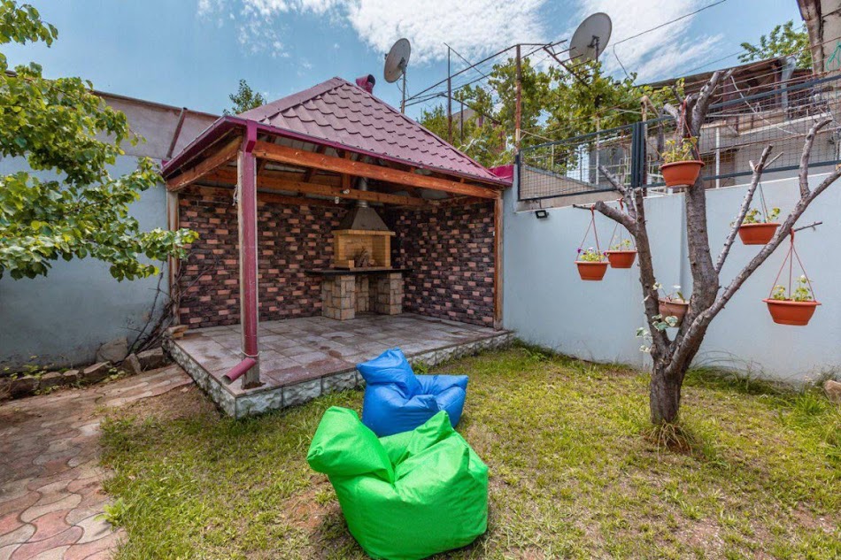 • კეთილმოწყობილი ეზო ბარბექიუს ზონით და პატარა ხელოვნური ჩანჩქერით